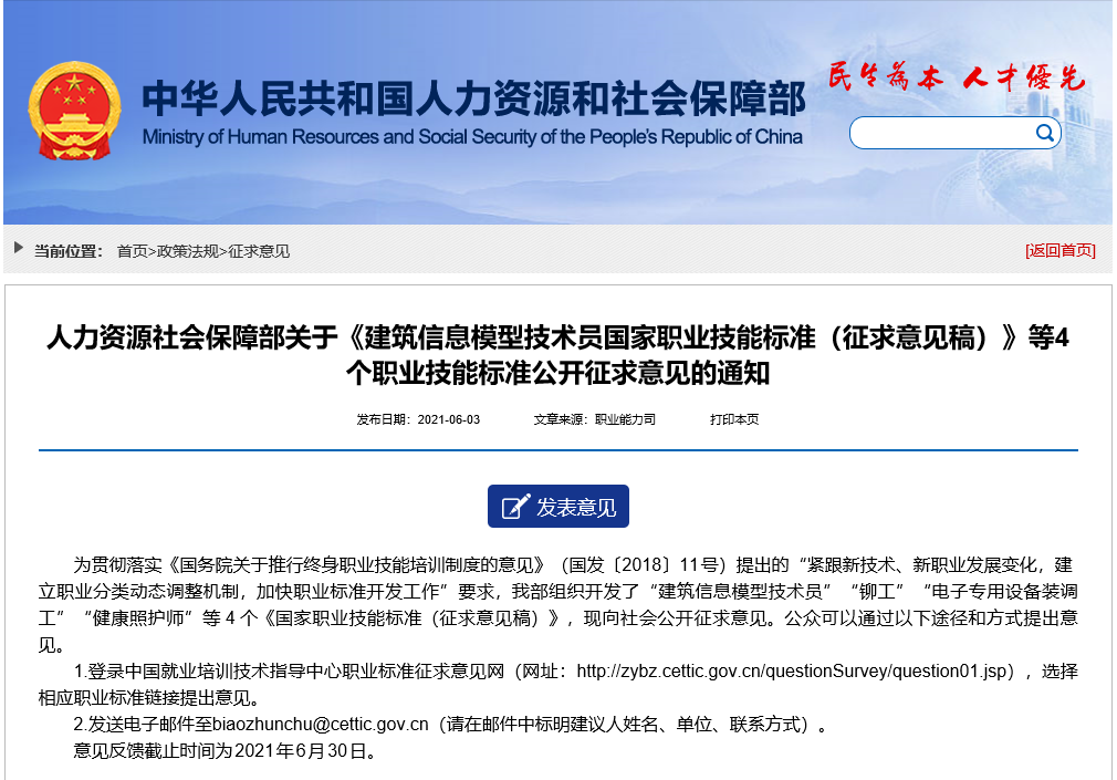 为贯彻落实《国务院关于推行终身职业技能培训制度的意见》(国发〔2018〕11号)提出的“紧跟新技术、新职业发展变化,建立职业分类动态调整机制,加快职业标准开发工作”要求,我部组织开发了“建筑信息模型技术员”“铆工”“电子专用设备装调工”“健康照护师”等4个《国家职业技能标准(征求意见稿)》,现向社会公开征求意见。公众可以通过以下途径和方式提出意见。